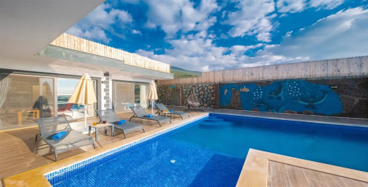 Salon : Villamızın iç dizaynı da son modaya uygun olarak modern bir şekilde tasarlanmıştır. Çeşitli dekoratif eşyalarla süslediğimiz salonumuz havuzlu bahçeye açılıyor. Villa salonunda oturma grubu, TV, internet, klima, sehpa bulunmaktadır.