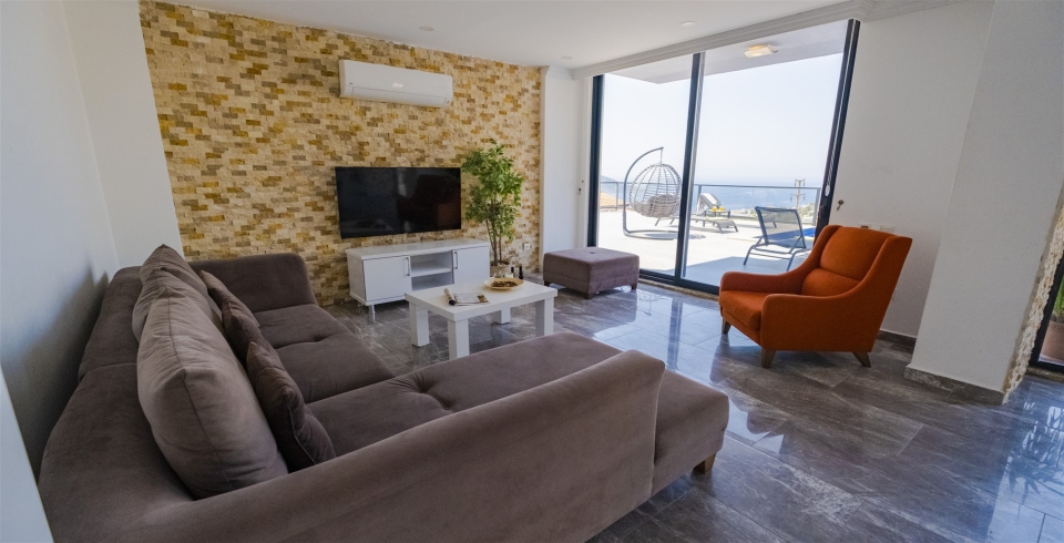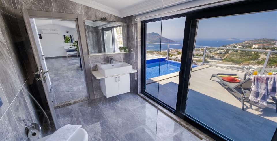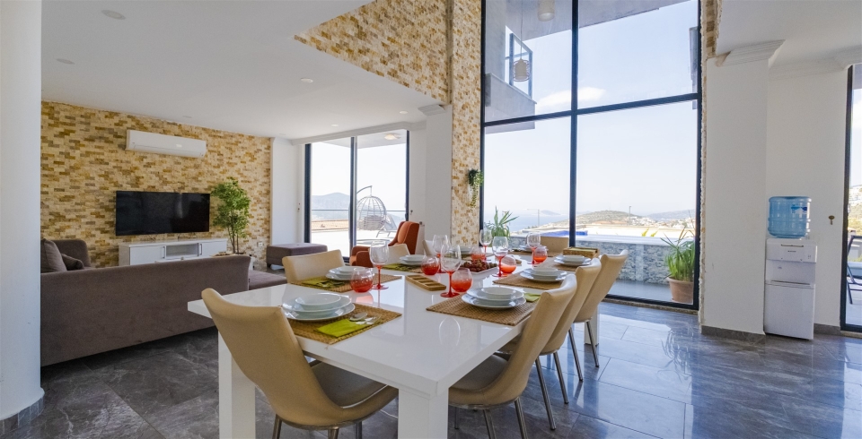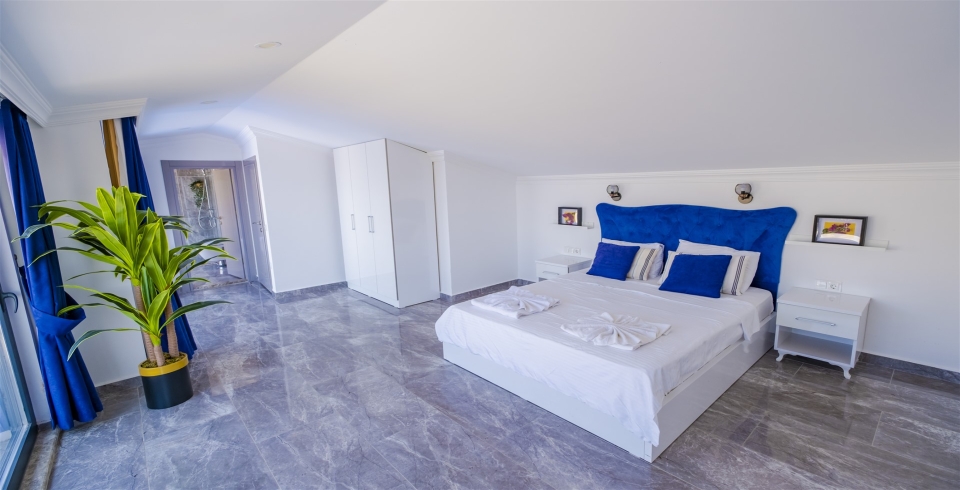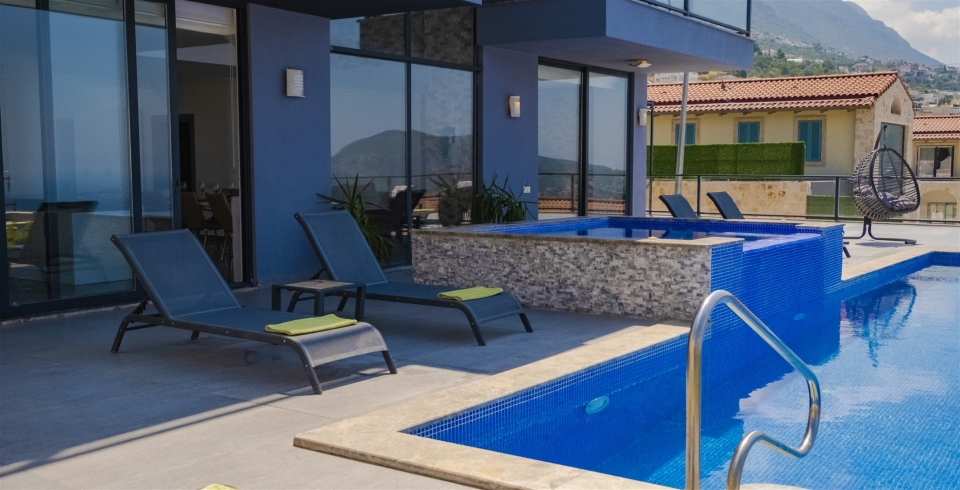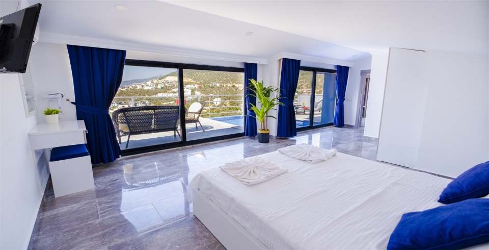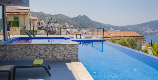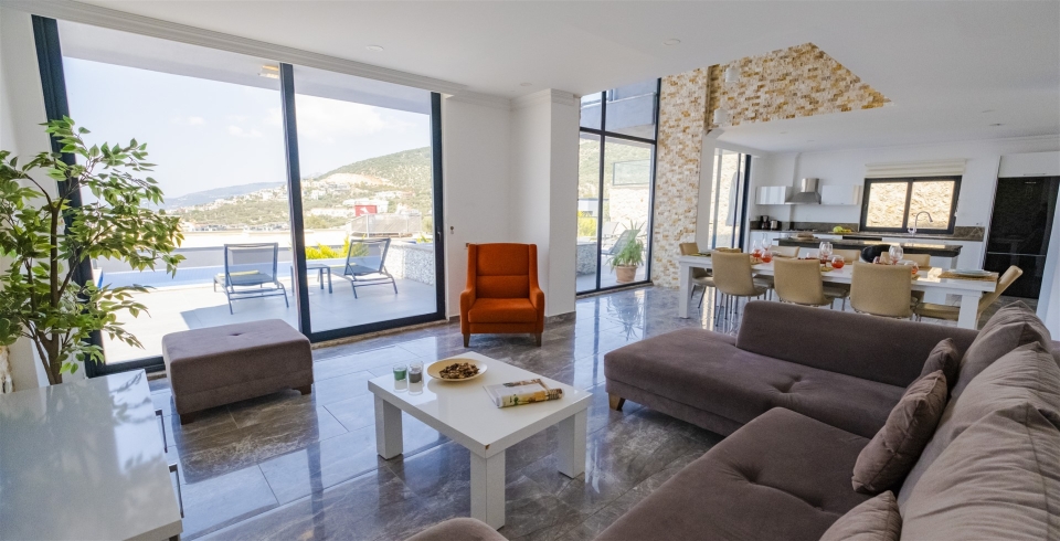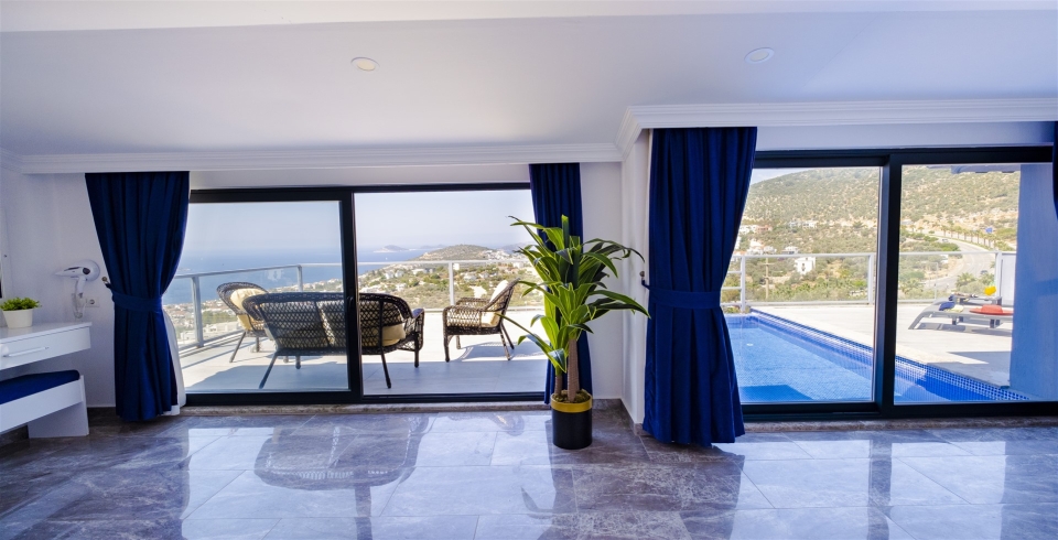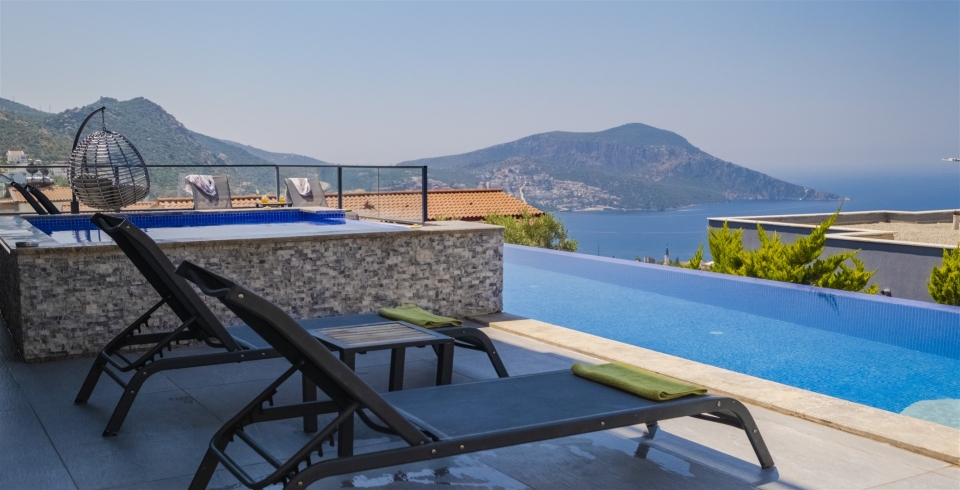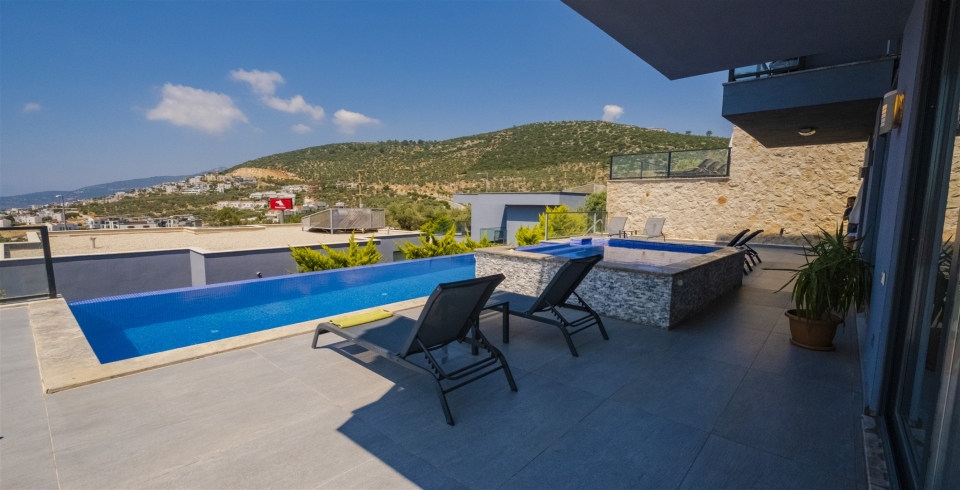 Villa Şelale 1, Kalkan'ın Kızıltaş bölgesinde etkileyici bir mülktür. Villada, biri zemin katta ve dördü üst katlarda olmak üzere 5 adet ebeveyn banyolu yatak odası bulunmaktadır. Mermer ve demirden yapılmış zarif bir spiral merdiven, üst katları zemin kata bağlar. Villanın öne çıkan özelliklerinden biri, çatı terasına açılan, bir dalma havuzu içeren ve muhteşem manzaralar sunan en üst kattaki ana yatak odasıdır. Villanın iç mekanı, aydınlık ve ferah hissettiren açık planlı bir tasarıma sahiptir. Zemin kattaki oturma odası ve mutfak, havuz terasının manzarasını güzel bir şekilde vurgulayan yüksek bir çift pencereden gelen doğal ışıkla doludur. Geniş sürgülü kapılar, sonsuzluk havuzu bulunan cömert bir havuz terasına açılır. Bu teras, dağların ve denizin muhteşem manzaralarını seyrederken barbekü yapmak için mükemmeldir ve yemek yemek, güneşlenmek veya salıncak sandalyesinde dinlenmek için bolca alan sunar.