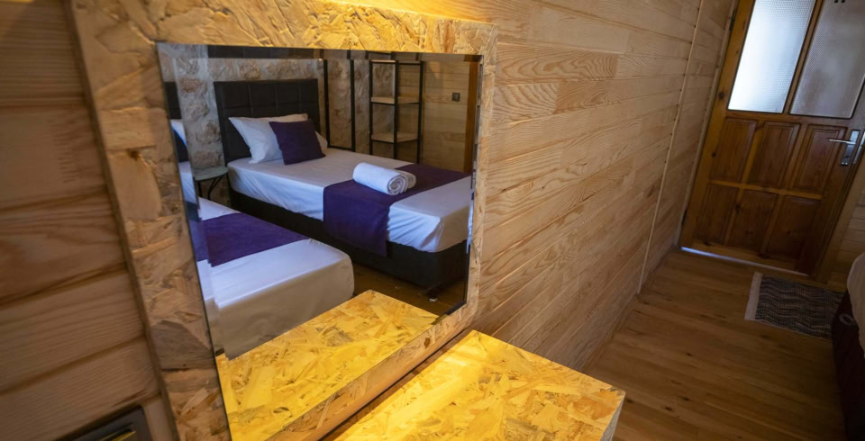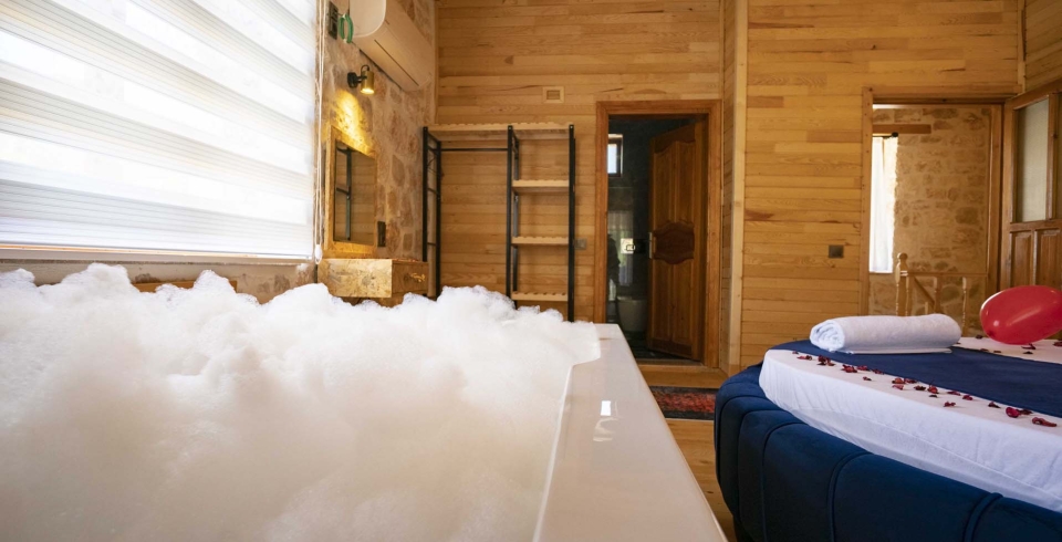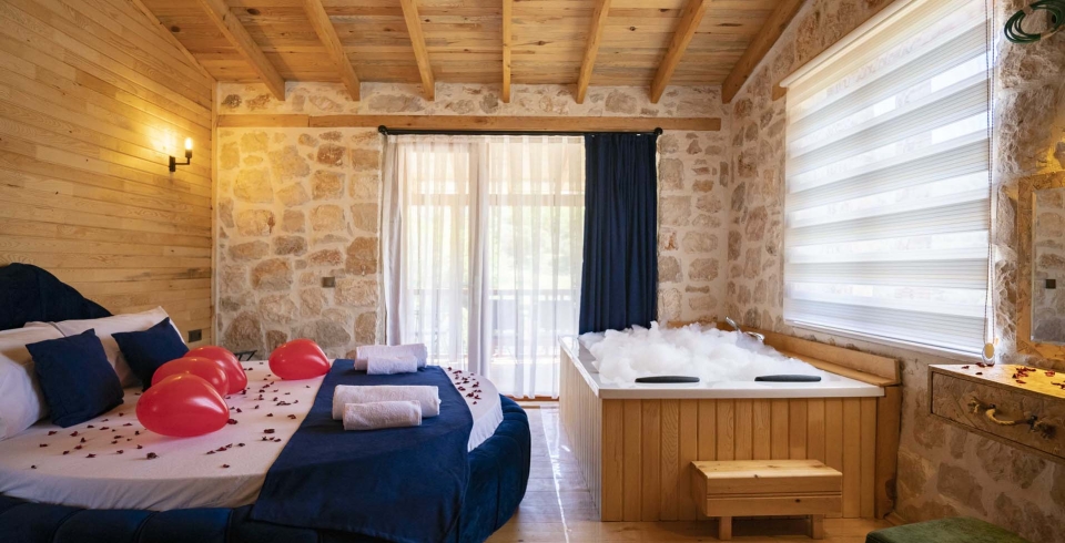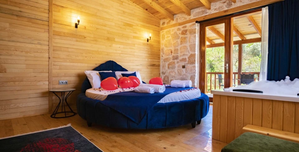 1. Yatak Odası: Çift kişilik yatak, klima, jakuzi, komodin, elbise dolabı, makyaj masası, banyo ve tuvalet bulunmaktadır.