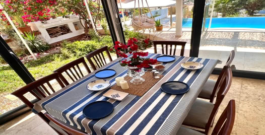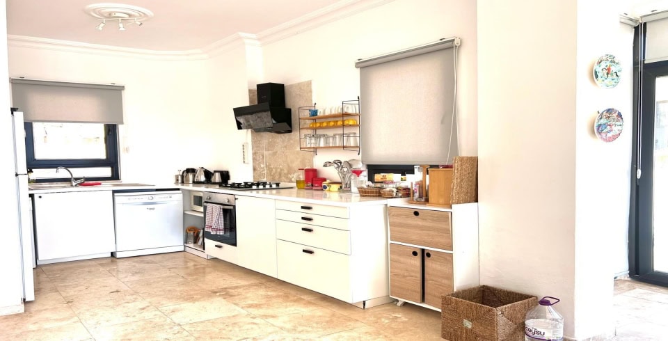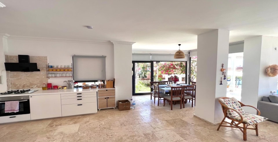 Mutfak : Villa içinde modern Amerikan mutfak bulunmaktadır. Mutfakta mikrodalga fırın, bulaşık makinası, ankastre fırın, buzdolabı, çamaşır makinası, ankastre 4’lü ocak, elektrikli su ısıtıcı kettle, ekmek kızartma makinası, tencere ve tava takımı, 8 kişilik yemek takımı, kaşık ve çatal seti ve bardaklar bulunmaktadır. Havuz başına geçiş bulunmaktadır.