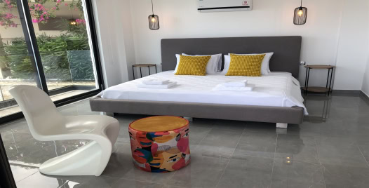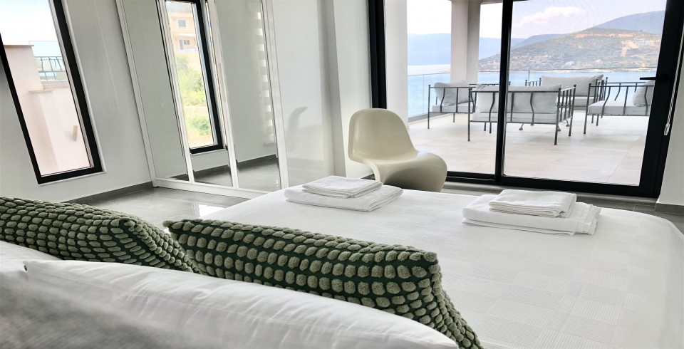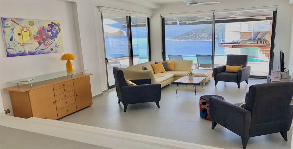 Salon: Deniz manzaralı salonda; konforlu oturma grubu, elbise dolabı, TV, havuz terasına çıkış bulunmaktadır.