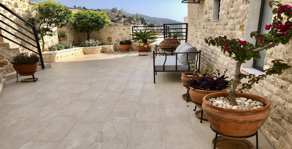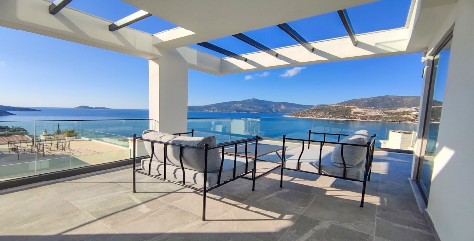 Açık plan salon ve tam donanımlı mutfak, geniş cam kapılarla havuz terasına açılır. Havuz terasında şezlonglar, oturma alanı ve barbekü bölümü bulunurken, 6,3 m x 4 m ölçülerinde özel yüzme havuzu tatilinize keyif katar. Villanın üst katında yer alan çatı terası, panoramik manzarayı izlemek ve akşam serinliğinde dinlenmek için ideal bir alandır.