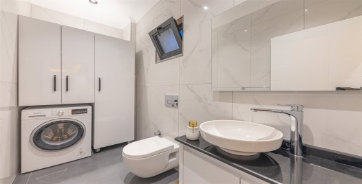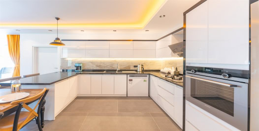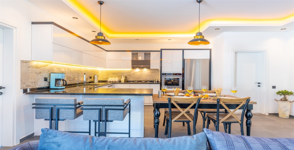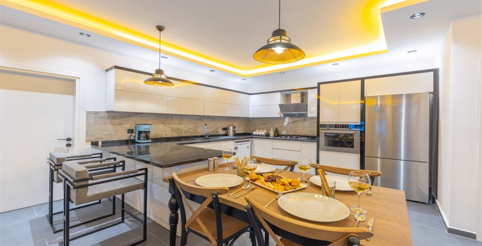 Mutfak: Modern Amerikan mutfak içerisinde ankastre 4lü ocak, ankastre fırın, yemek masası, buzdolabı, bulaşık makinesi, su ısıtıcısı, bardak takımı, yemek takımı, çatal-bıçak takımı, çamaşır makinesi, tavalar, tencereler ve diğer yemek pişirme ekipmanları bulunmaktadır.