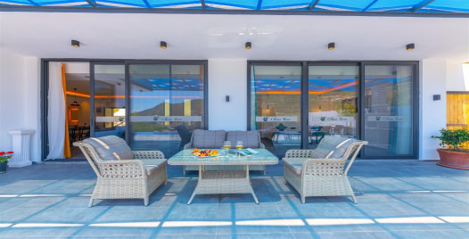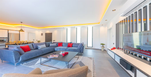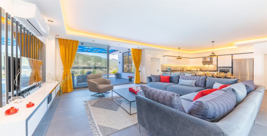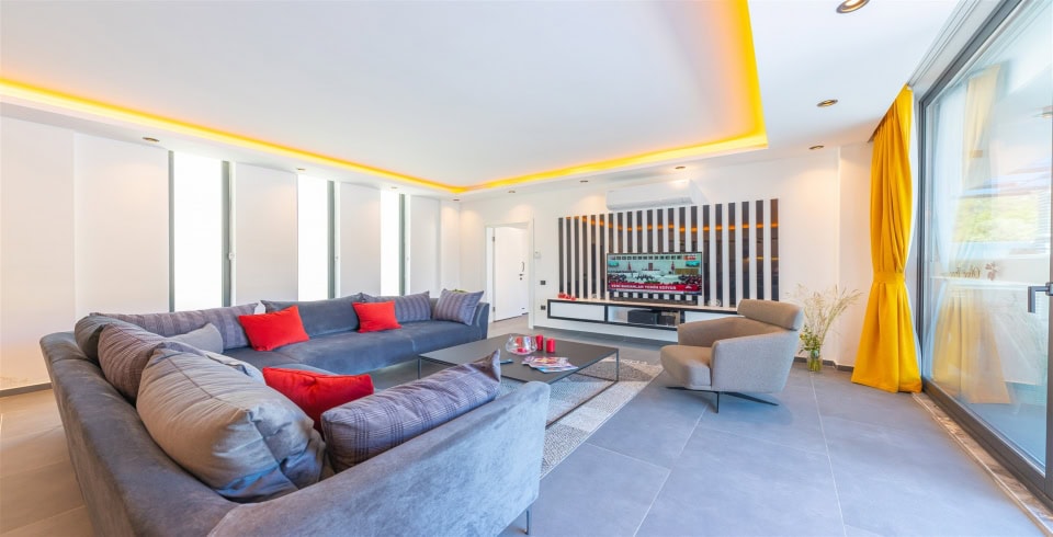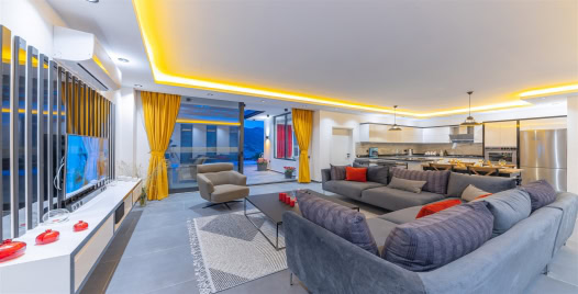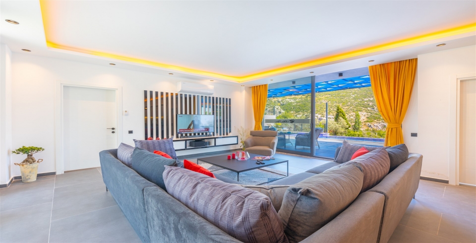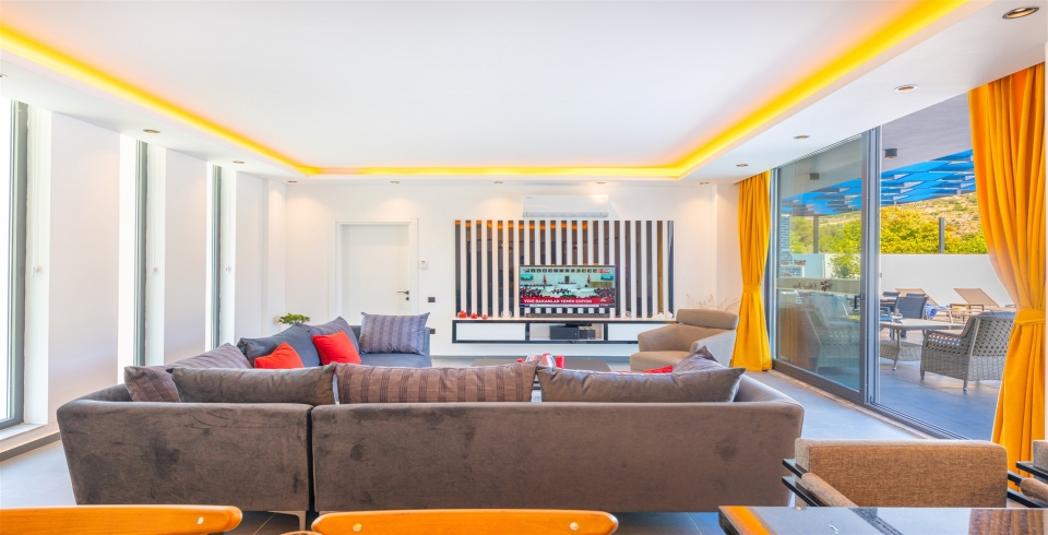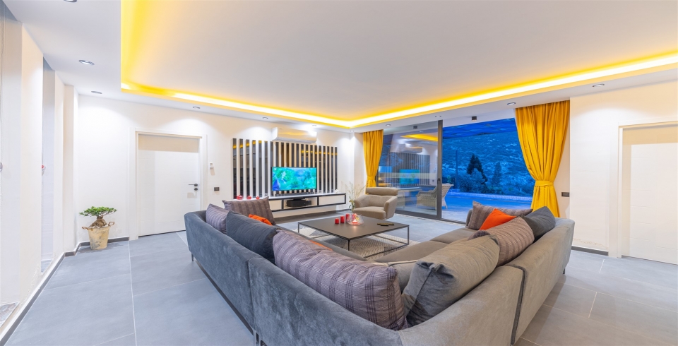 Salon: Villamızın geniş ve ferah salon katı içerisinde oturma grubu, LCD TV, yemek masası, kablosuz modem, uydu, sehpa, ütü, ütü masası, elektrik süpürgesi, klima, banyo ve tuvalet bulunmaktadır. Salondan havuz terasına direk çıkış yapılabilmektedir.