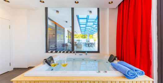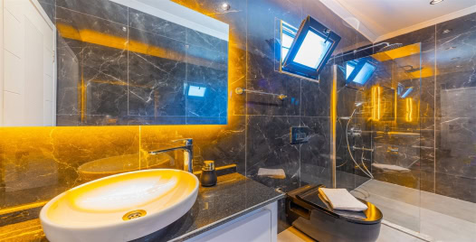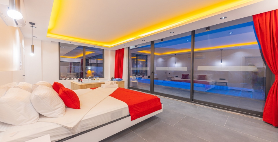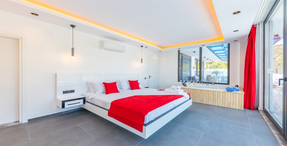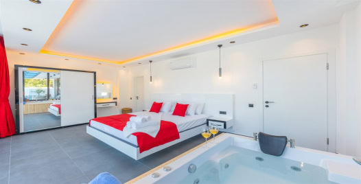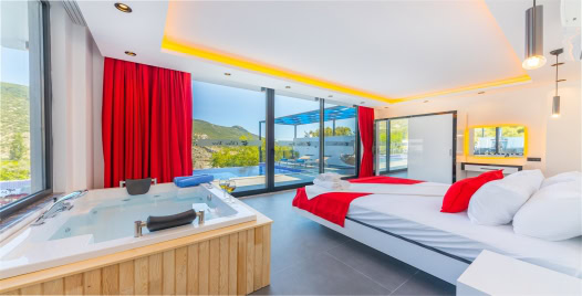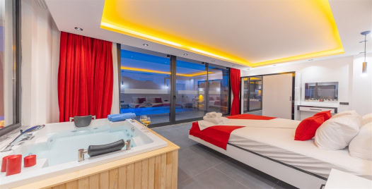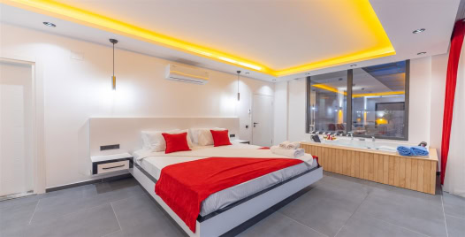 1.Yatak Odası: 1 adet çift kişilik yatak, klima, elbise dolabı, makyaj masası, komodin, çift kişilik jakuzi, banyo ve tuvalet bulunmaktadır.