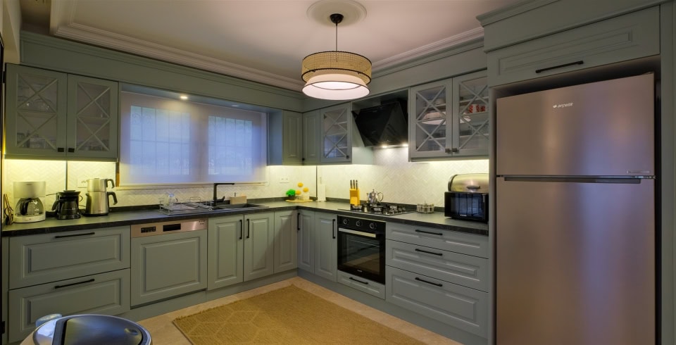 Mutfak: Açık planlı mutfak, 6 kişiye yetecek kadar mutfak malzemeleri, buzdolabı, fırın, ocak, mikrodalga fırın, bulaşık makinesi, çamaşır makinesi, tost makinesi, kettle ve çaydanlık bulunmaktadır..