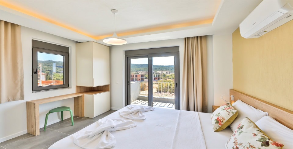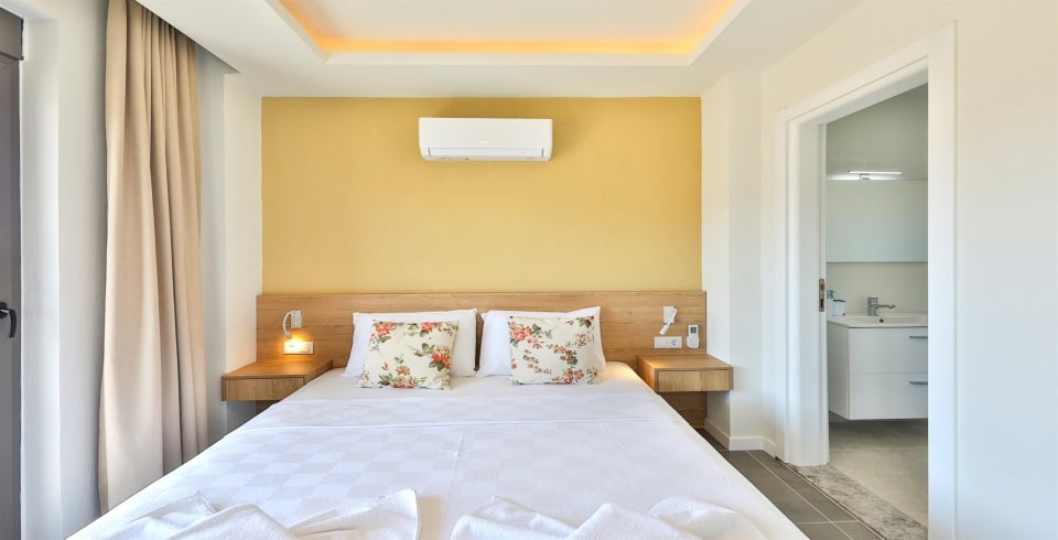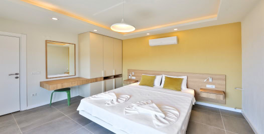 2. Yatak Odası : 1 adet çift kişilik yatak, klima, komodin, elbise dolabı, makyaj masası, banyo ve tuvalet bulunmaktadır.