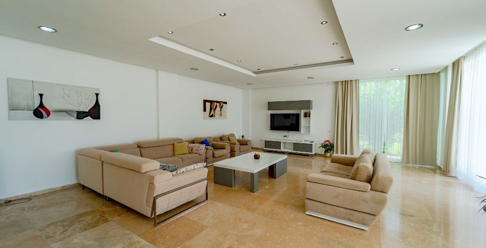 Salon : Villamızın geniş ve ferah salonunda oturma grubu, TV, uydu, internet, klima, 10 kişilik yemek masası, lavabo bulunmakta olup havuz terasına çıkış yapılabilmektedir.