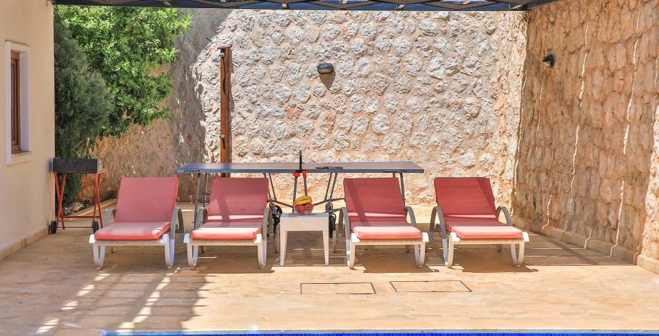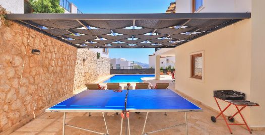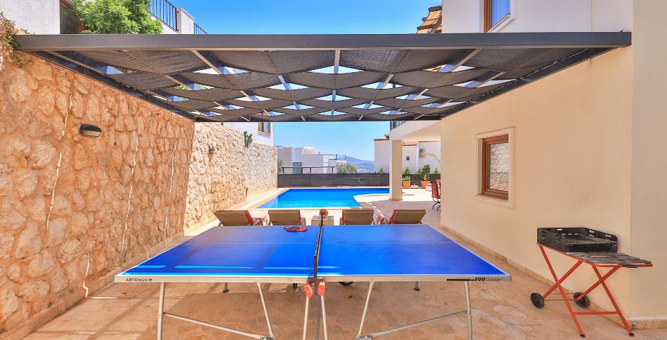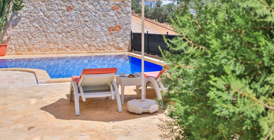 Havuz ve Bahçe: Kiralık yazlığımızın deniz manzaralı havuzu bulunmaktadır. Bahçede şezlong, şemsiye, mangal, masa ve sandalyeler bulunmaktadır.