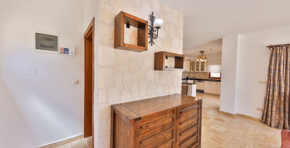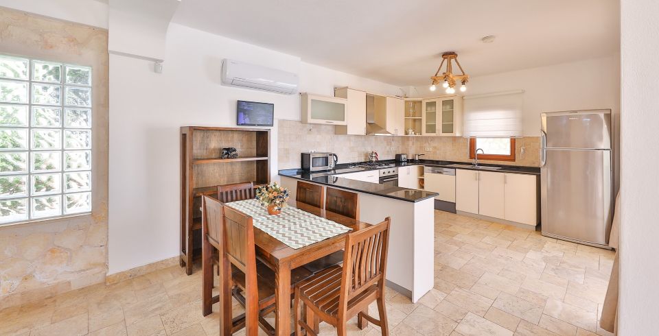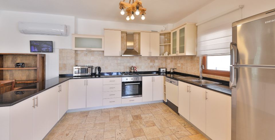 Mutfak: Buzdolabı, çamaşır makinesi, bulaşık makinesi, ankastre fırın, mikrodalga fırın, elektrikli su ısıtıcısı, ekmek kızartma makinesi, yemek takımı, mutfak araç gereçleri ve ayrıca havuz terasına çıkış bulunmaktadır.