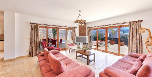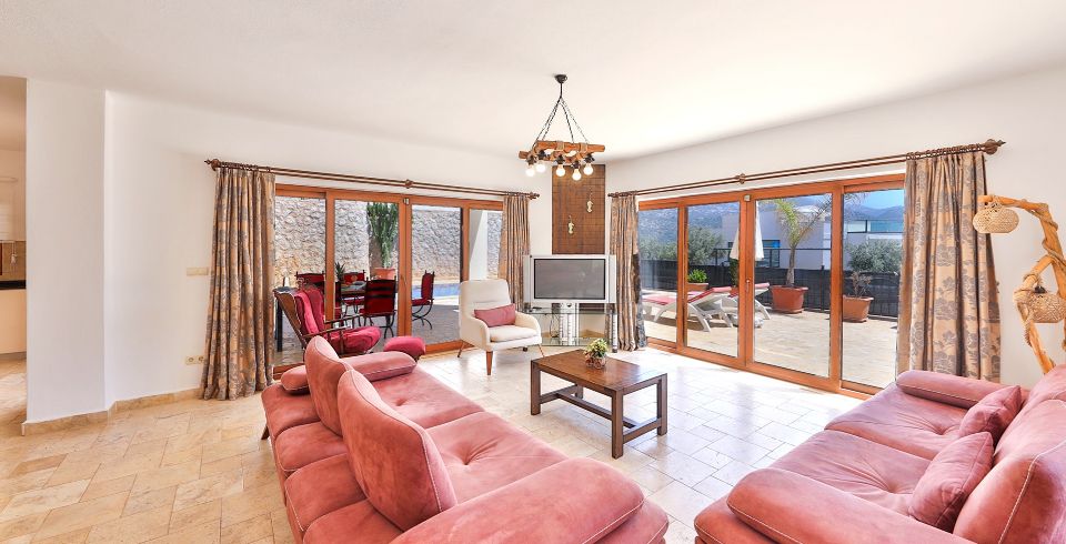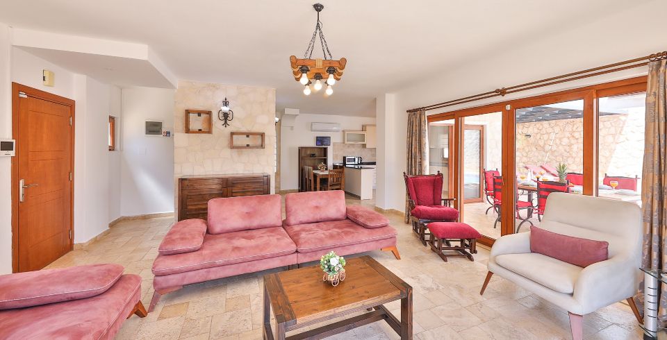 Salon: Deniz manzaralı geniş salonunda oturma grubu, plazma TV, uydu alıcısı, ütü ve ütü masası, klima, 6 kişilik yemek masası, tuvalet ve lavabo ayrıca havuz başına çıkış bulunmaktadır.