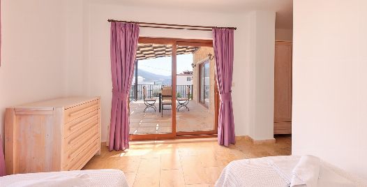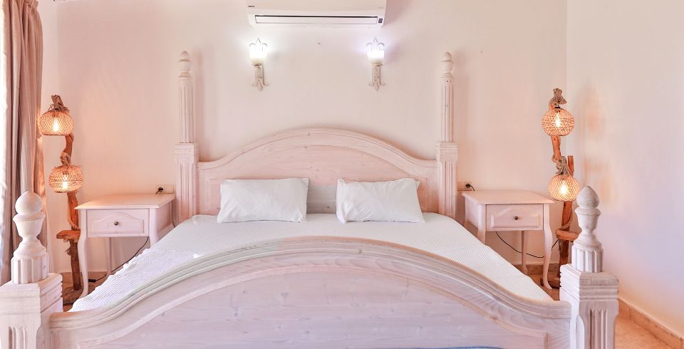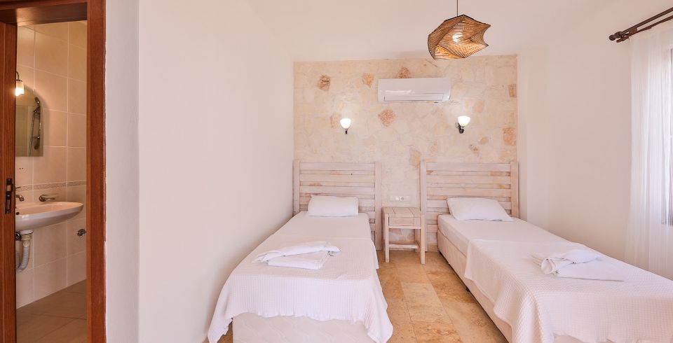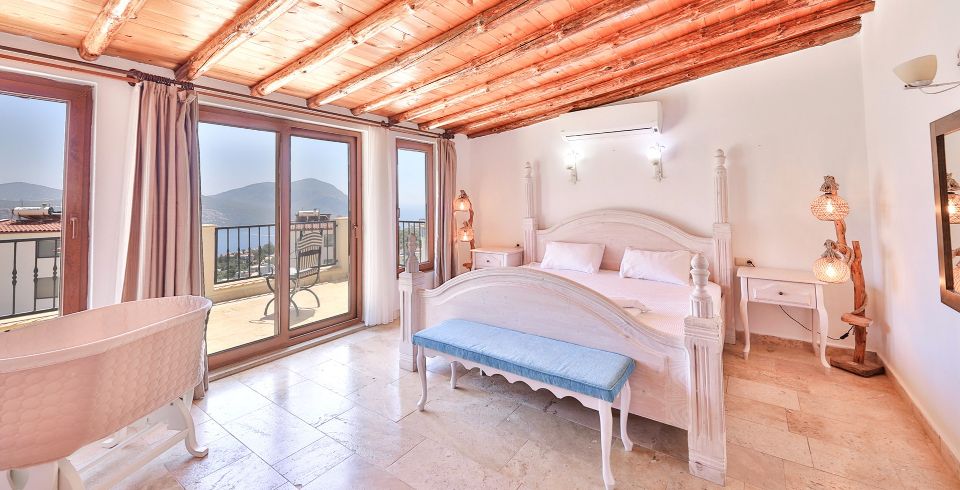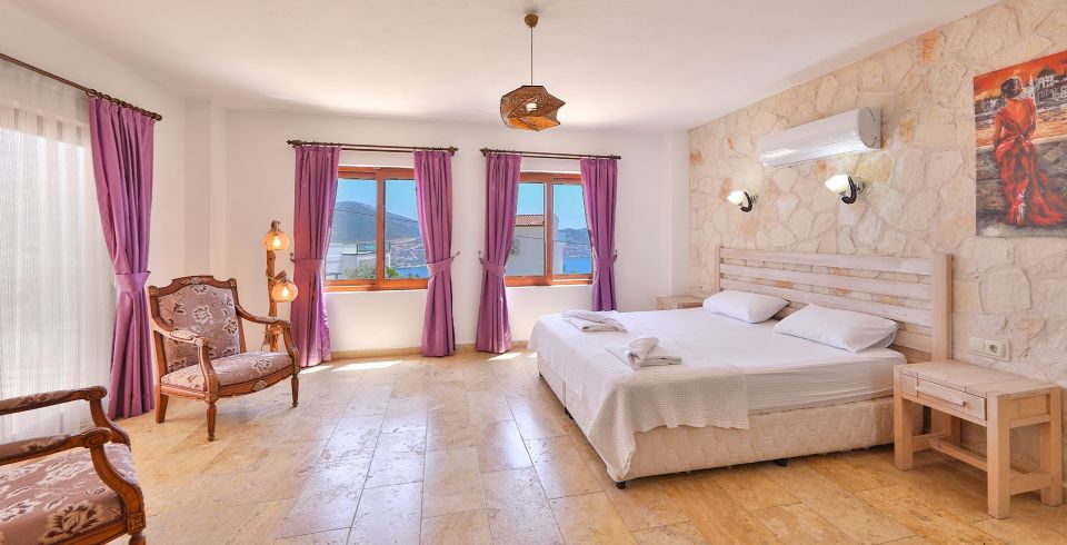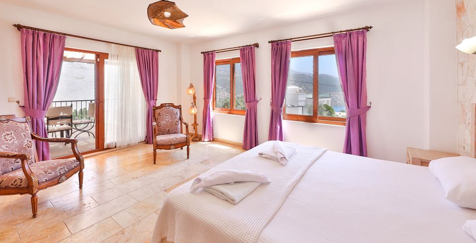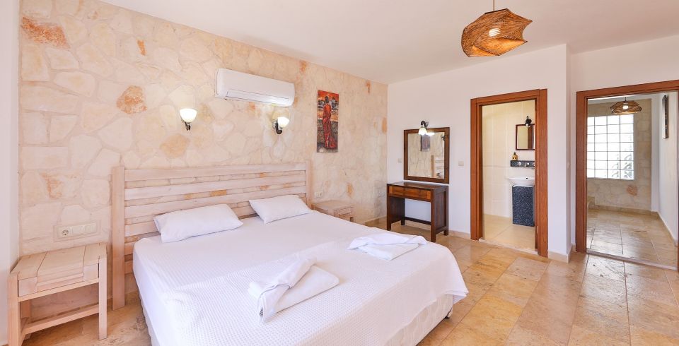 Yatak Odası 2 : Deniz manzaralı en-süit odada çift kişilik yatak, komodin, klima, makyaj masası, banyo ve tuvalet bulunmaktadır.