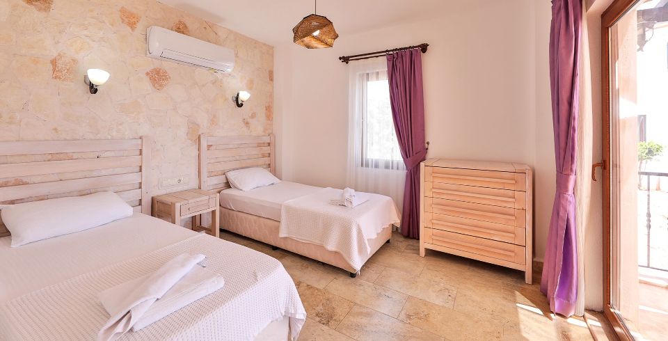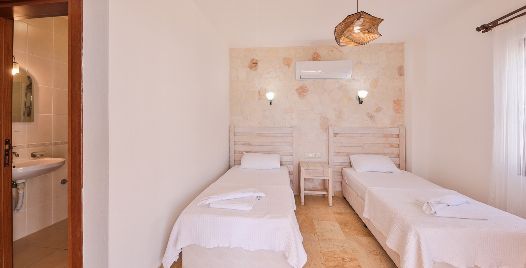 Yatak Odası 1 : En-süit odada 2 adet tek kişilik yatak, komodin, klima, makyaj masası, elbise dolabı, banyo ve tuvalet bulunmaktadır.