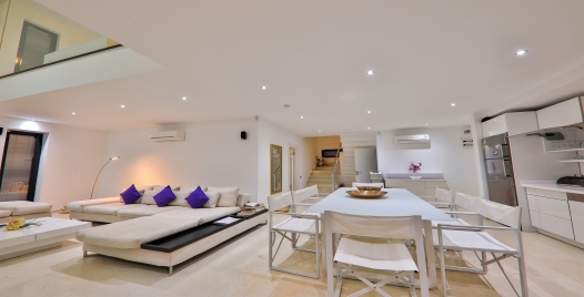 Zemin katta açık plan salon, yemek ve mutfak alanı yer almaktadır. Geniş cam sürgü kapılarla havuz terasına açılan bu bölüm ferah ve aydınlıktır. Salon bölümünde konforlu oturma grubu, televizyon, iklimlendirme ve kaliteli mobilyalar kullanılmıştır. Mutfakta ise gazlı ocak, fırın, bulaşık makinesi, buzdolabı, mikrodalga ve eksiksiz mutfak gereçleri mevcuttur.