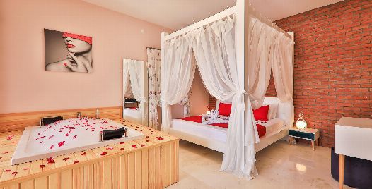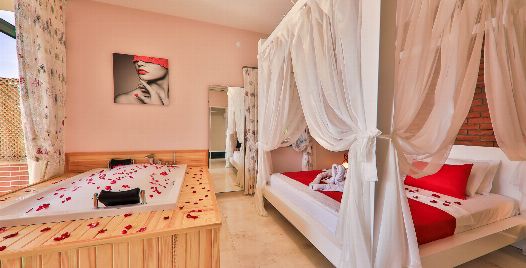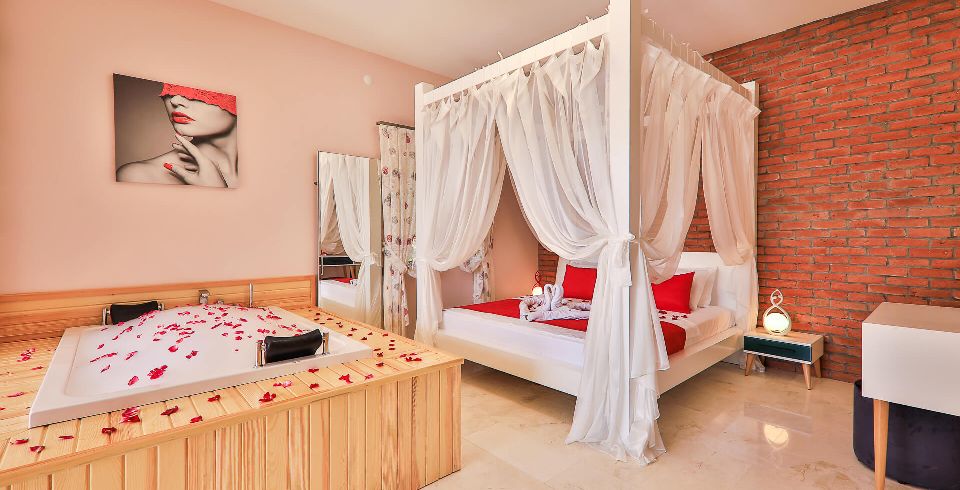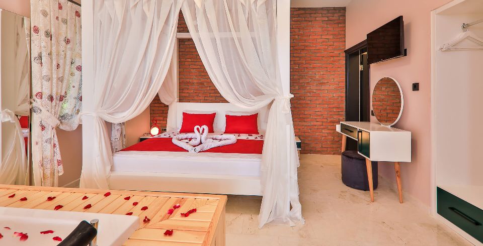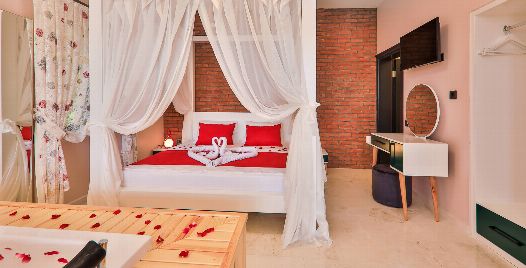 Yatak Odası : Sakin ve huzur dolu olan çift kişilik yatak odamızda ferahlamak istediğinizde açabileceğiniz klima, televizyon, makyaj masası, komodin, saç kurutma makinesi, elbise dolabı, lavabo ve banyo bulunmaktadır. Ayrıca lüks bir konfor içinde tatilinizi geçirmeniz adına odamızda jakuzi bulunmaktadır.