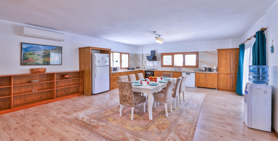 Mutfak : Modern Amerikan mutfak içerisinde 8 kişilik yemek masası, mama sandalyesi, buzdolabı, bulaşık makinası, fırın, ocak, mikrodalga fırın, tost makinası, yemek masası, yemek takımları, çatal ve bıçak takımları, tencere ve tava takımları, bardaklar bulunmaktadır.
