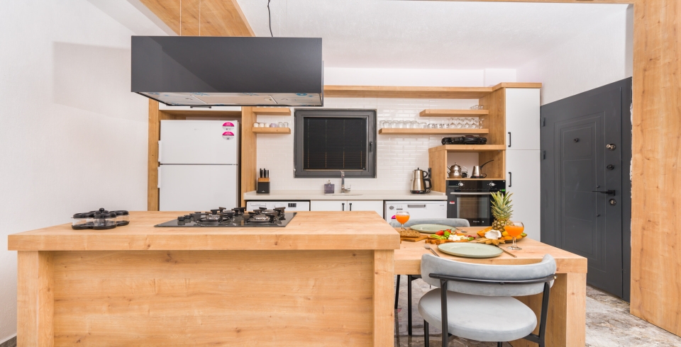 Mutfak: Açık planlı mutfak, 2 kişiye yetecek kadar mutfak malzemeleri, buzdolabı, fırın, ocak, mikrodalga fırın, bulaşık makinesi, çamaşır makinesi, tost makinesi, kettle ve çaydanlık bulunmaktadır..