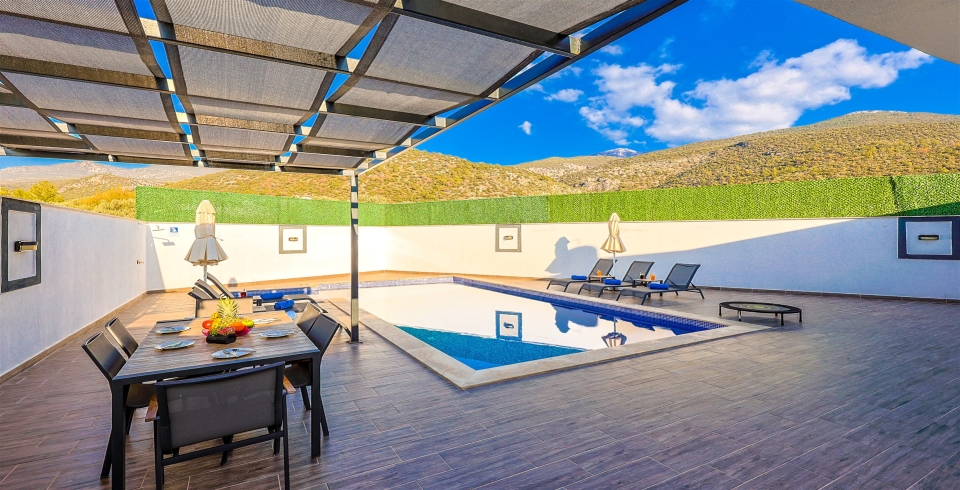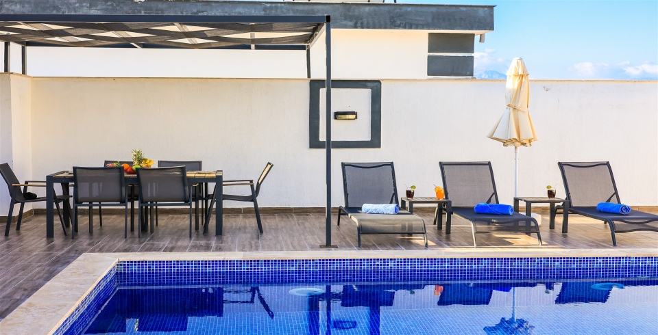 Villamız 2 katlıdır üst katında havuz ve havuz terası bulunmaktadır. Havuz terası korunaklı bir hale getirilmiştir, dışarıdan görünmemektedir. Üst katta bulunan yatak odalarından bir tanesinde tüm yılın yorgunluğunu atabileceğiniz jakuzi yer almaktadır. Diğer oda havuz terasının alt katında yer almaktadır.