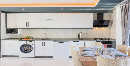 Mutfak : Modern Amerikan mutfağımızda yemek masası, buzdolabı, çamaşır makinesi, mikrodalga fırın, 4’lü ocak, elektrikli su ısıtıcısı, çatal-bıçak takımı, tencere-tava takımı, bulaşık makinesi bulunmaktadır.