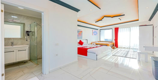 1. Yatak Odası : Çift kişilik yatak, klima, komodin, jakuzi, makyaj masası, elbise dolabı, banyo ve lavabo bulunmaktadır.