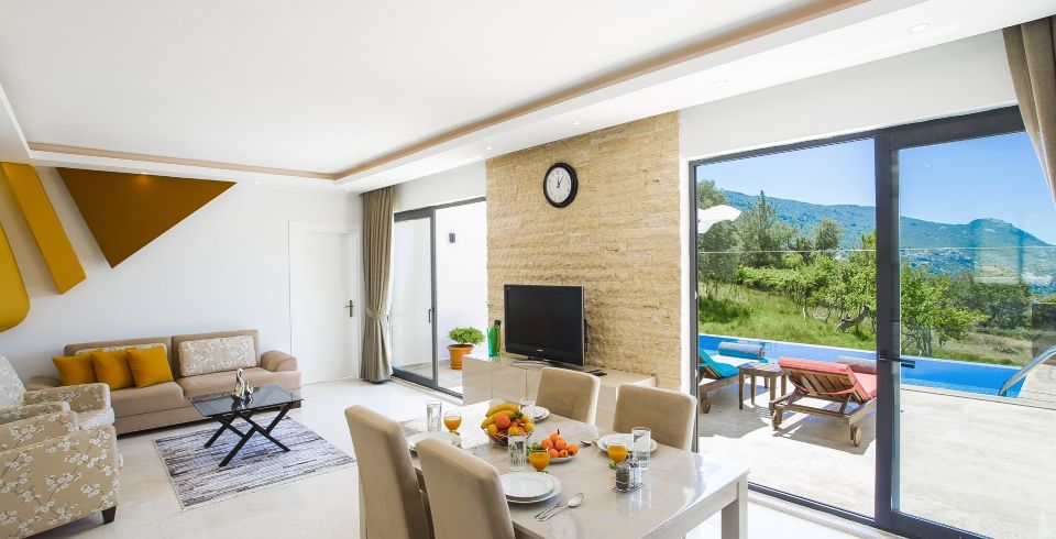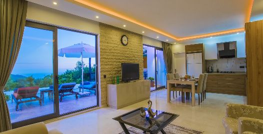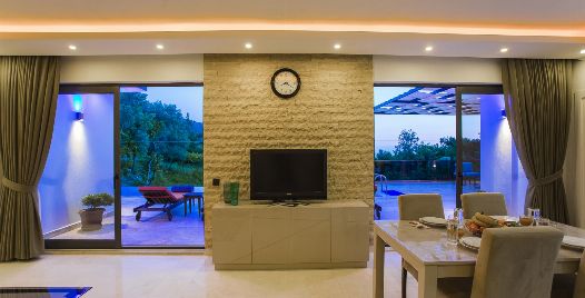Salon : Villa Şila’nın salonunda sizi şık bir oturma grubu ile klima, televizyon, internet, uydu, koltuk, sehpa ile ferah bir salon bekliyor olacaktır. Havuz terasına çıkış yapılmaktadır.