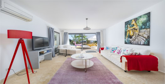 Salon : Oturma grubu, televizyon, klima, sehpa, internet ve havuz terasına çıkış bulunmaktadır.