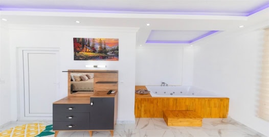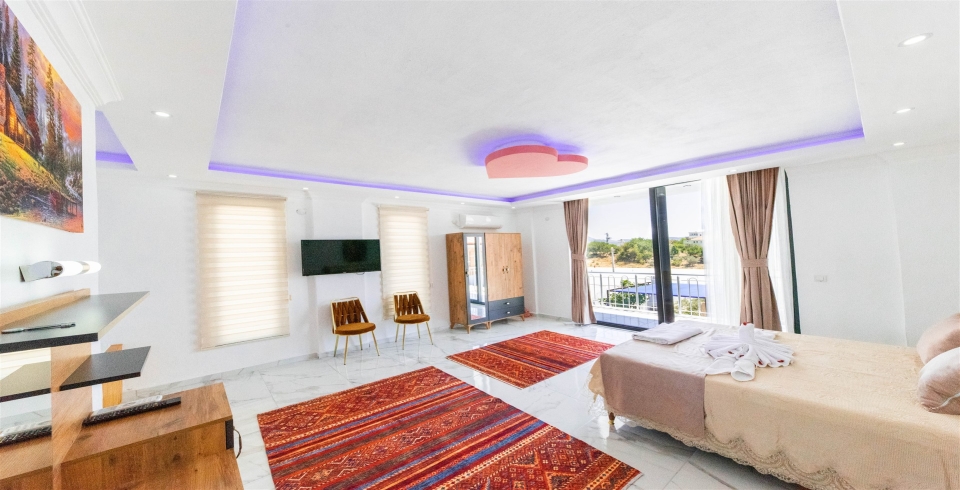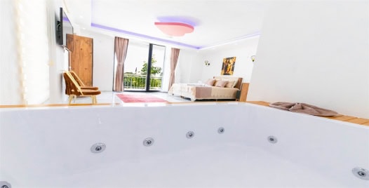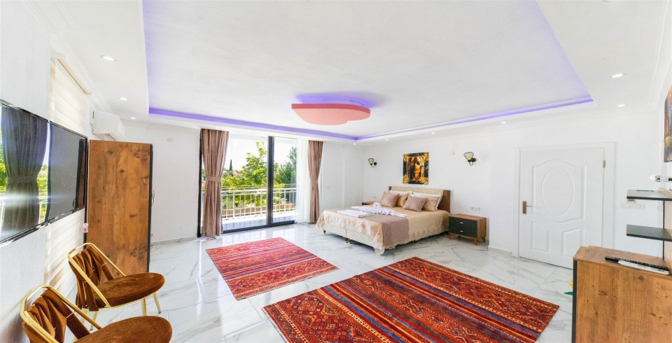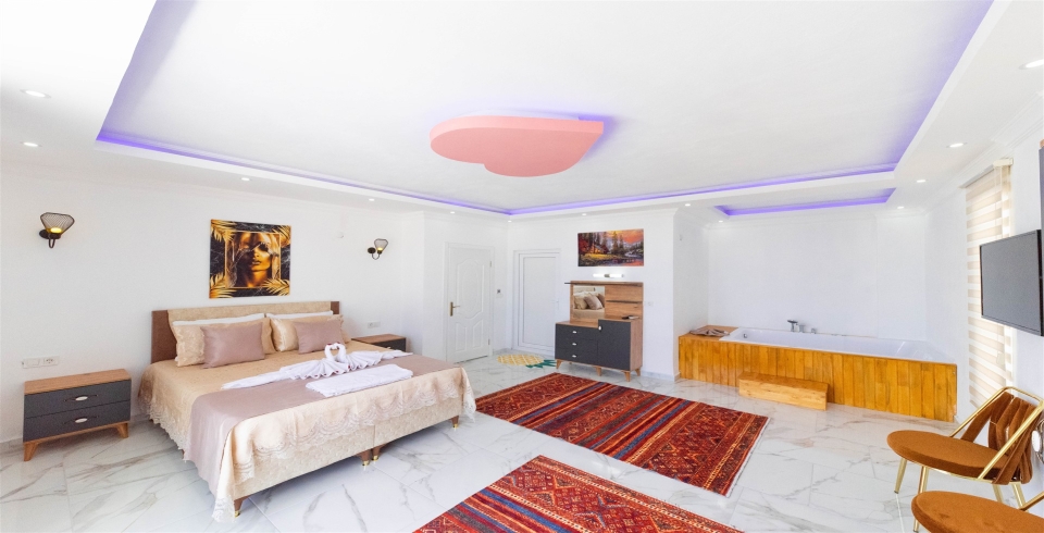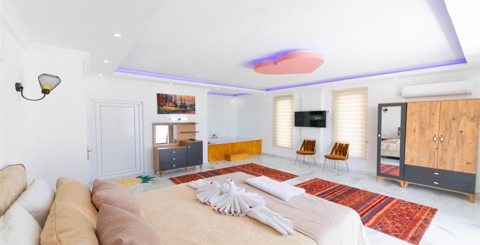 Geniş ve özenle düzenlenmiş bahçesi, ailenizle birlikte stresten uzak, huzurlu ve keyifli bir tatil geçirmeniz için tasarlanmıştır. Ana yatak odasında yer alan jakuzi ise konaklamanıza ekstra bir rahatlık ve lüks katar.