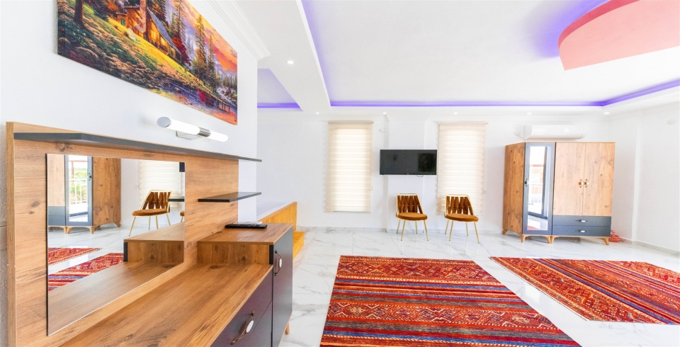 Salon : Kiralık villamızın salonunda oturma grubu, TV, uydu, internet, DVD, sehpa bulunmaktadır.