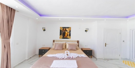 1. Yatak Odası : Çift kişilik yatak odası, klima, elbise dolabı, makyaj masası, komodin, banyo ve WC bulunmaktadır.