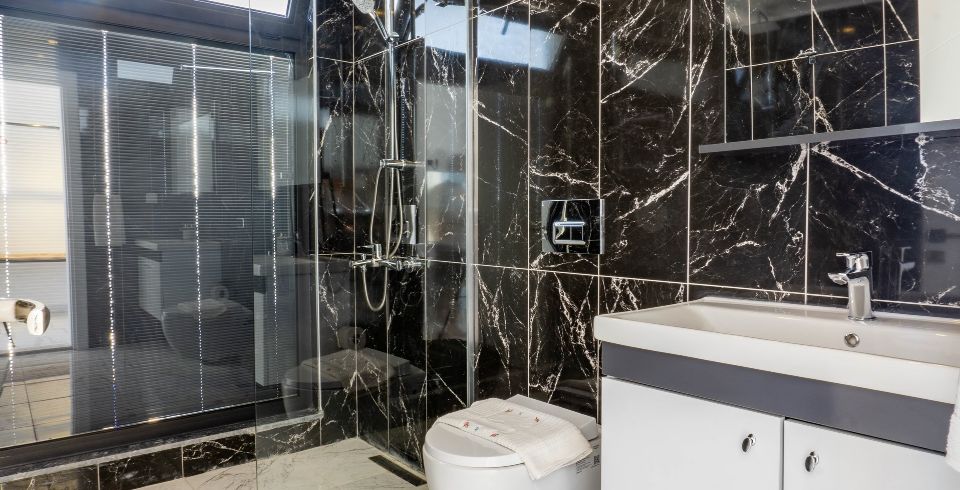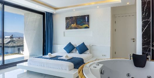 1. Yatak Odası: Çift kişilik yatak, klima, jakuzi, komodin, elbise dolabı, makyaj masası, banyo ve tuvalet bulunmaktadır.