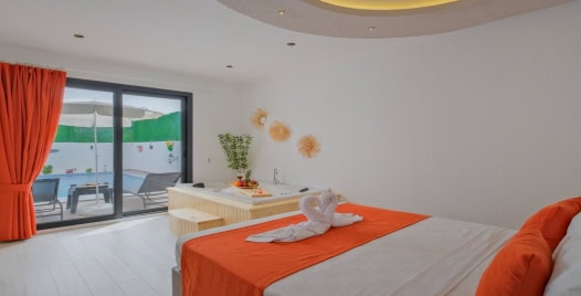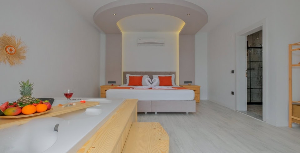 1. Yatak Odası: Çift kişilik yatak, klima, jakuzi, komodin, elbise dolabı, makyaj masası, banyo ve tuvalet bulunmaktadır.