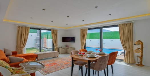 Salon: Villa salonunda konforlu oturma grubu, klima, TV, internet, uydu alıcı, yemek masası, sehpa bulunmaktadır.