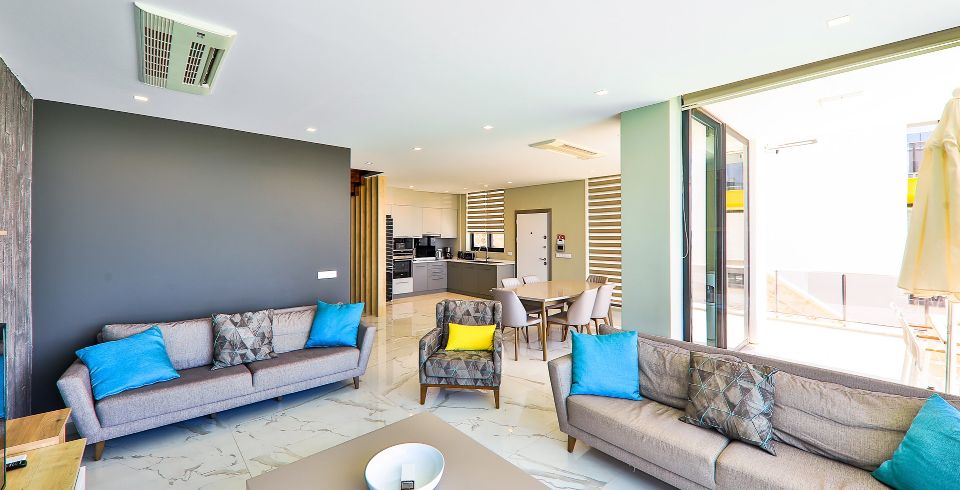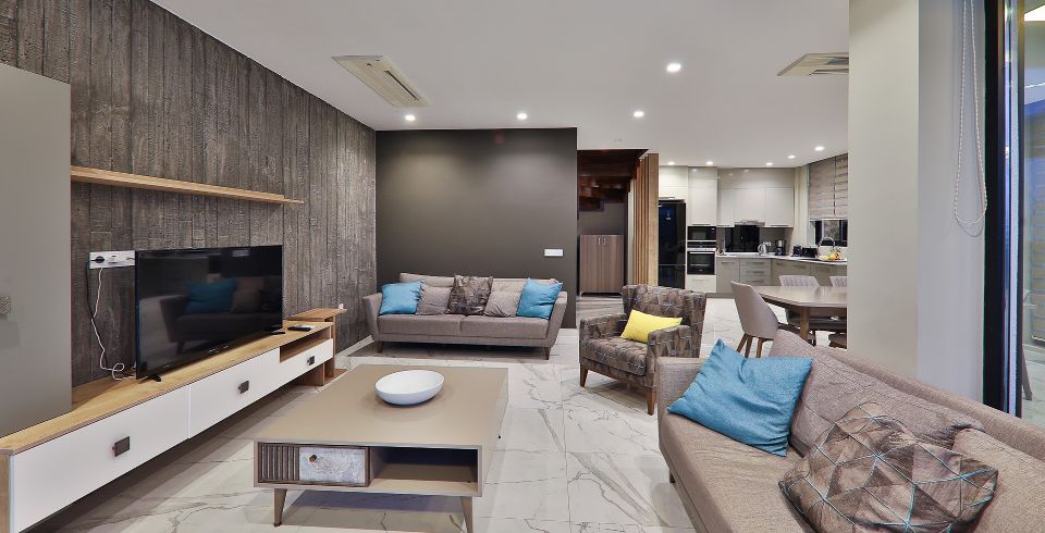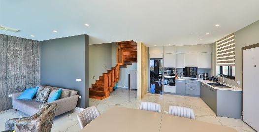 Mutfak: Modern dizaynlı, tam donanımlı Amerikan mutfak içerisinde buzdolabı, çamaşır ve bulaşık makinesi, 4lü ocak, mikrodalga fırın, kettle, tost makinesi, yemek masası, yemek takımı, çatal bıçak takımı, tava ve tencereler bulunmaktadır.