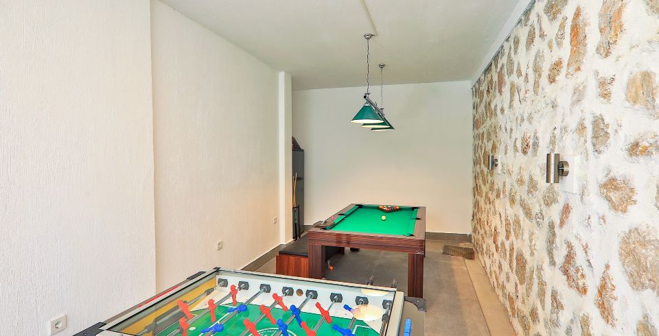Salon: Villamızın salon katı geniş ve ferah bir yapıda olup içerisinde oturma grubu, klima, LCD TV, uydu alıcısı, modem ve yemek masası bulunmaktadır. Salon katından havuz terasına direk çıkış vardır. Villamızın bir alt katında bulunan diğer salonunda oturma grubu, TV ünitesi, TV ve langırt bulunmaktadır.