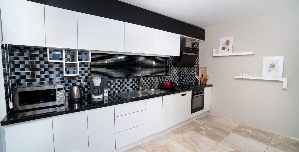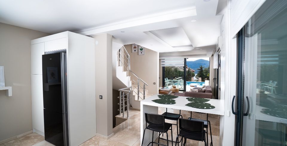Mutfak : Villa içinde modern Amerikan mutfak bulunmaktadır. Mutfakta mikrodalga fırın, bulaşık makinası, ankastre fırın, buzdolabı, çamaşır makinası, ankastre 4’lü ocak, elektrikli su ısıtıcı kettle, ekmek kızartma makinası, tencere ve tava takımı, 8 kişilik yemek takımı, kaşık ve çatal seti ve bardaklar bulunmaktadır. Havuz başına geçiş bulunmaktadır.