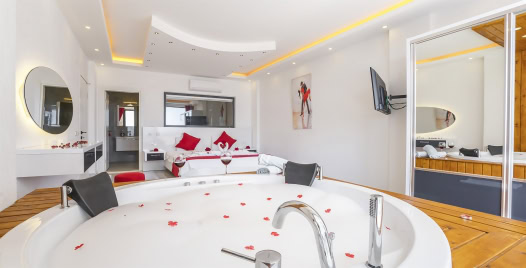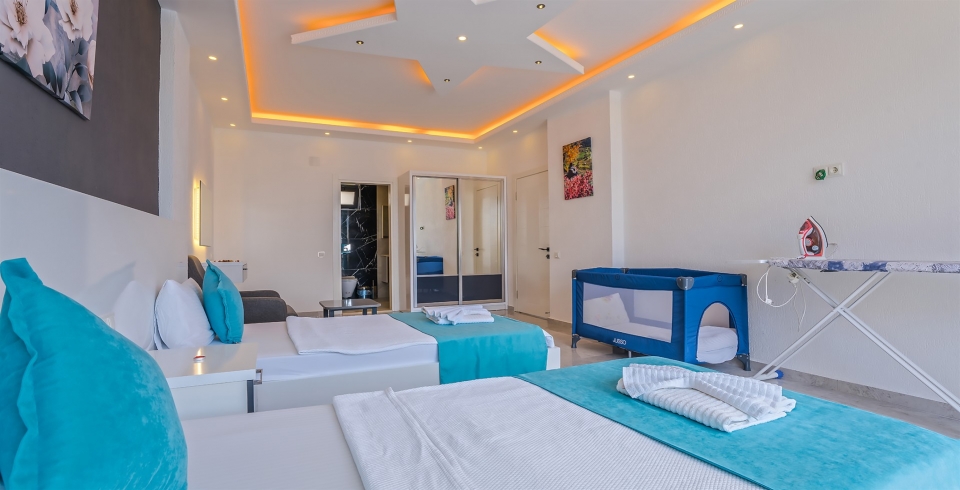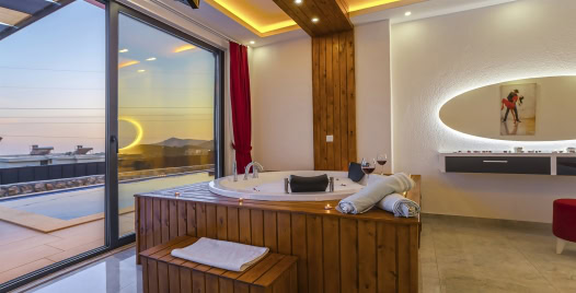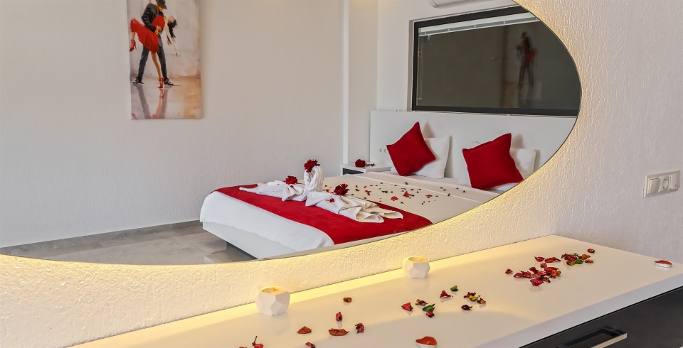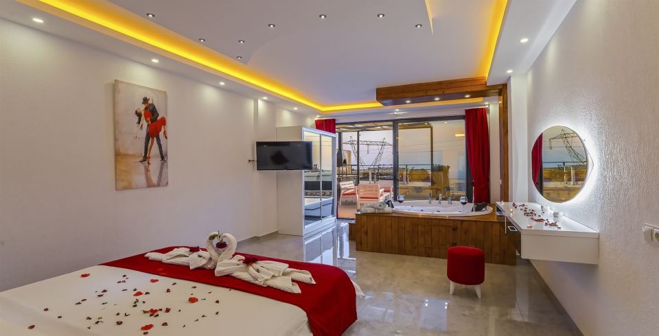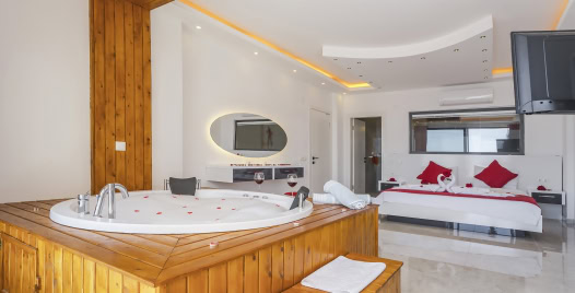 1. Yatak Odası : Süit yatak odası çift kişilik konfor yatak, jakuzi, tv, klima, gardırop, komodin, ve banyo-WC yer almaktadır.