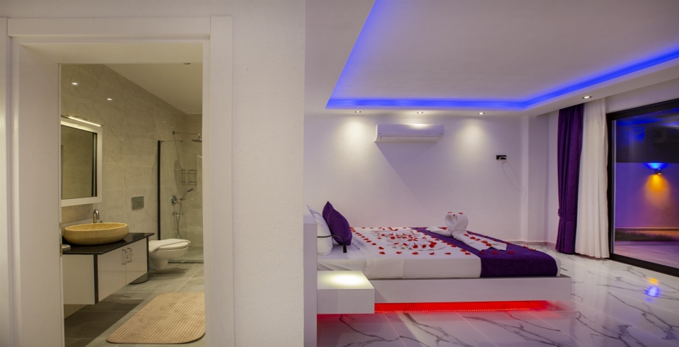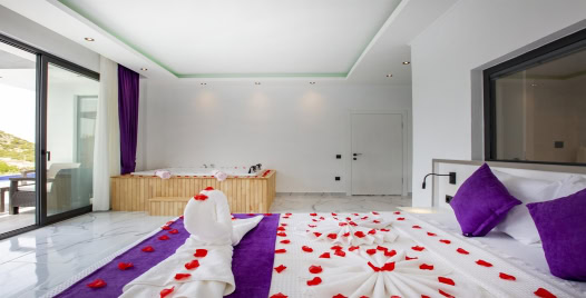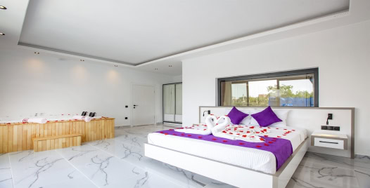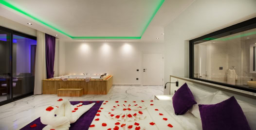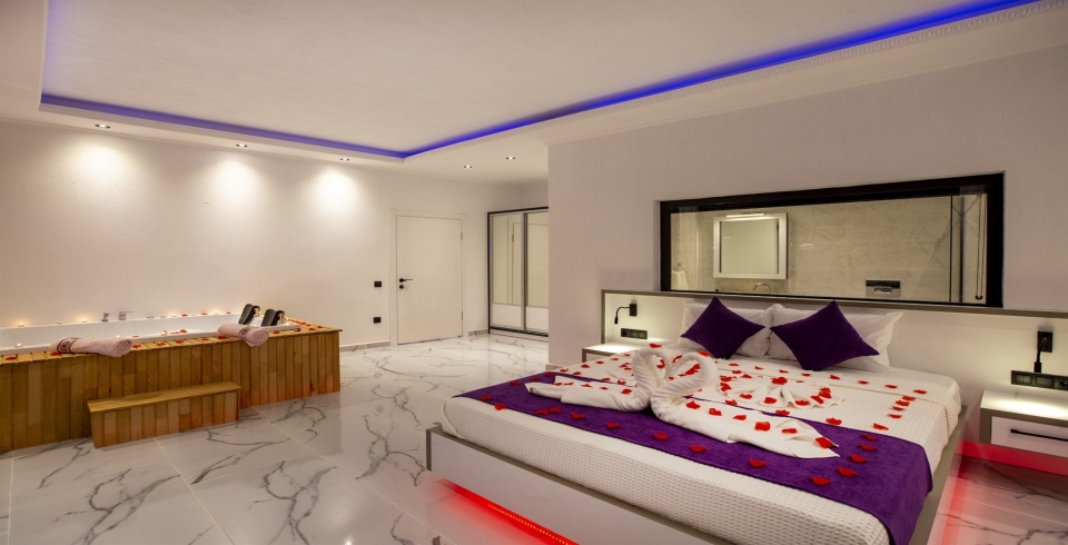 Yatak Odası : Çift kişilik balayı süit odamızda jakuzi, 1 adet çift kişilik yatak, klima, elbise dolabı, makyaj masası, komodin, jakuzi, banyo ve lavabo bulunmaktadır.