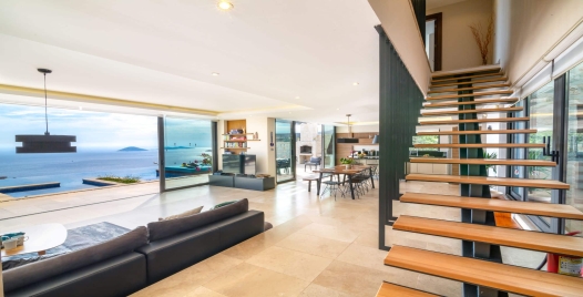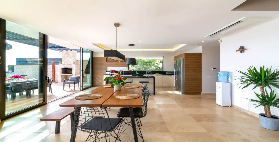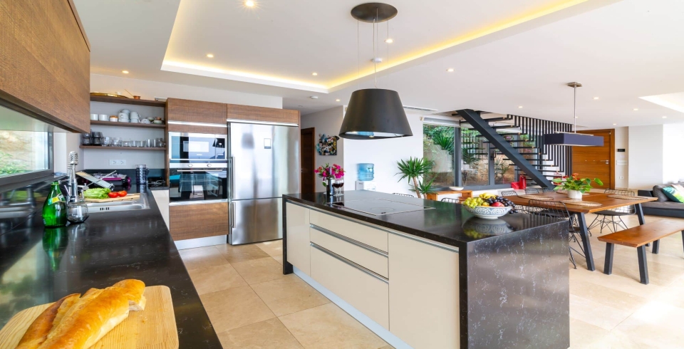 Villanın zemin katında, deniz manzaralı geniş bir salon ve tam donanımlı açık mutfak yer alır. Zeminden tavana uzanan cam kapılar sayesinde iç mekân gün ışığıyla dolarken, havuz terasına doğrudan erişim sağlanır. Salonda büyük bir oturma grubu, akıllı televizyon ve yemek masası bulunur. Mutfak bölümünde buzdolabı, fırın, bulaşık makinesi, mikrodalga, kahve makinesi ve mutfak gereçleri eksiksiz şekilde yer alır. Bu katta ayrıca bir misafir tuvaleti ve çamaşır odası da bulunmaktadır.