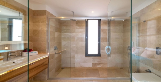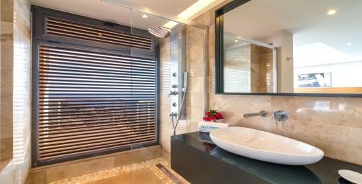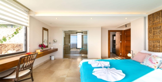 Üst katlarda toplam dört adet ebeveyn banyolu yatak odası yer alır. Birinci katta üç oda, ikinci katta ise ana süit yatak odası bulunmaktadır. Her odada deniz manzaralı balkon, gardırop, klima ve makyaj masası yer alır. Ana yatak odasında bulunan jakuzi, günün yorgunluğunu keyifle atmak isteyen misafirlere özel bir rahatlama alanı sunar.