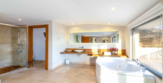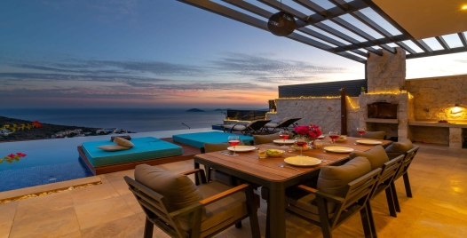 Villanın dış alanı, manzaranın tadını çıkarmak isteyenler için tasarlanmıştır. 11 metre uzunluğundaki sonsuzluk havuzu, jakuzili bölümüyle dikkat çeker. Geniş güneşlenme terasında şezlonglar, oturma alanı, barbekü ve gölgeli yemek masası bulunur. Terasta gün batımını izlerken Akdeniz’in huzur dolu atmosferi tatilinizi unutulmaz kılar.