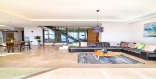Salon : Geniş, ferah, modern tasarlanmış bir salon ve salonumuzda oturma grubu, TV, DVD, TV ünitesi ve ses sistemi, muhteşem deniz manzarasına sahip olan salonumuzdan havuz başına çıkış bulunmaktadır.
