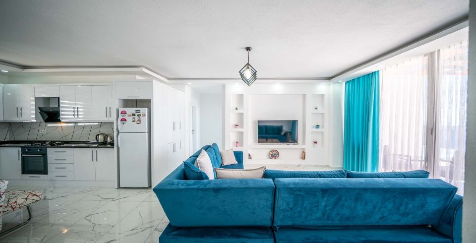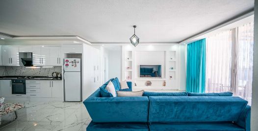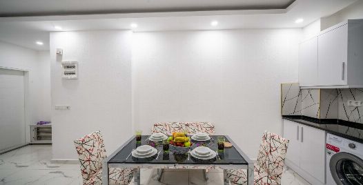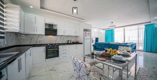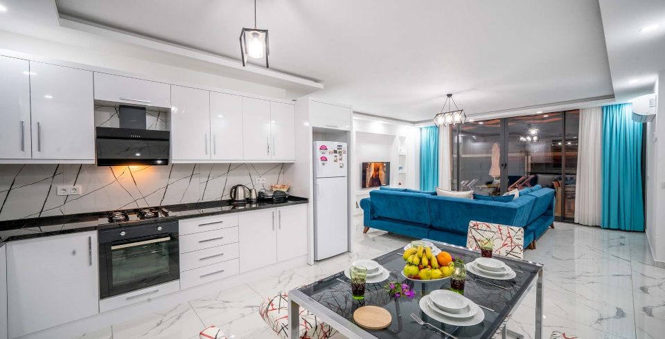 Mutfak : Modern Amerikan mutfak içerisinde 6 kişilik yemek masası, mama sandalyesi, buzdolabı, bulaşık makinası, fırın, ocak, mikrodalga fırın, tost makinası, yemek masası, yemek takımları, çatal ve bıçak takımları, tencere ve tava takımları, bardaklar bulunmaktadır.