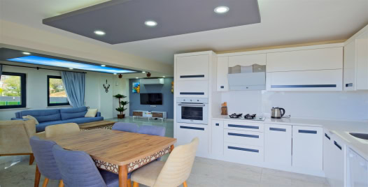 Mutfak : Villa içinde modern Amerikan mutfak bulunmaktadır. Mutfakta, bulaşık makinası, ankastre fırın, buzdolabı, çamaşır makinası, ankastre 4’lü ocak, elektrikli su ısıtıcısı, tencere ve tava takımı, 8 kişilik yemek takımı, kaşık ve çatal seti ve bardaklar bulunmaktadır. Havuz başına geçiş bulunmaktadır.