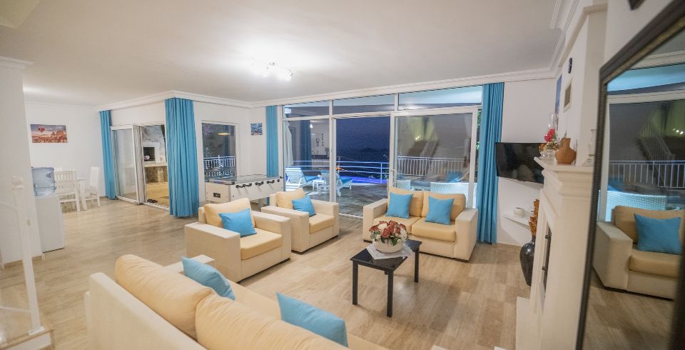 Salon : Salon içerisinde oturma grubu TV, uydu, klima, sehpa bulunmaktadır. Salonumuzdan havuz terasına çıkış yapılabilmektedir.