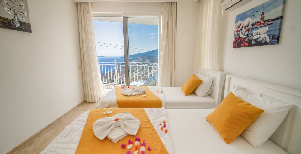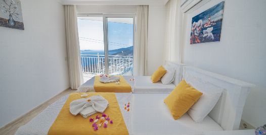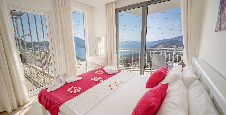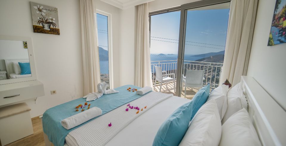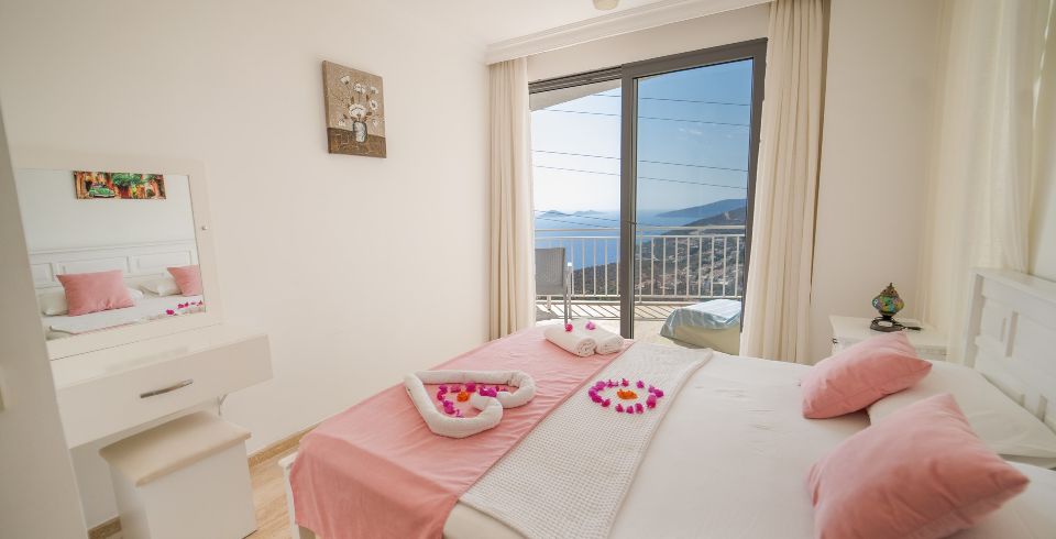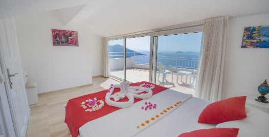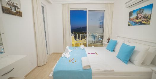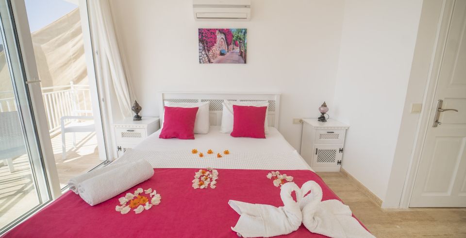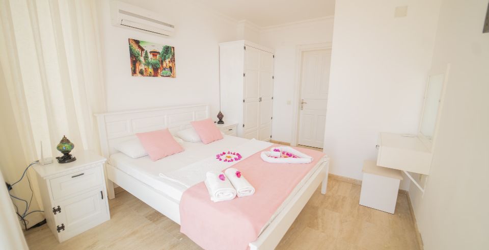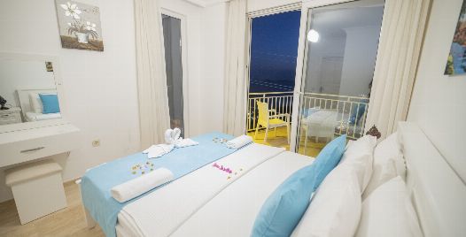1. Yatak Odası : Çift kişilik süit yatak odası, klima, makyaj masası, elbise dolabı, komodin, banyo ve lavabo bulunmaktadır. Deniz manzaralı balkona sahiptir.