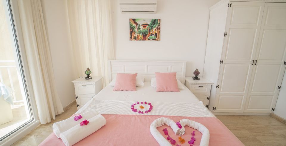 4. Yatak Odası : Çift kişilik süit yatak odası, klima, makyaj masası, elbise dolabı, komodin, banyo ve lavabo bulunmaktadır.