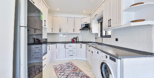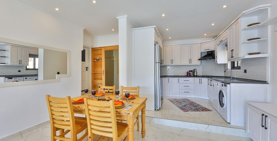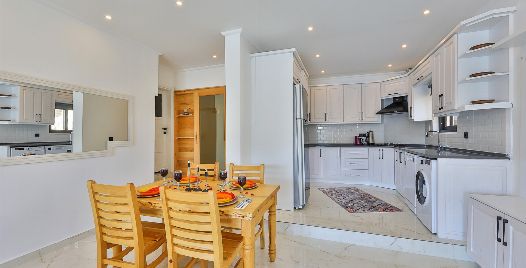 Mutfak : Amerikan açık mutfak, bulaşık makinası, buzdolabı, çamaşır makinası, su ısıtıcısı, fırın, 4'lü ocak seti, yemek masası ve mutfak araç gerekleri 4 kişilik olarak mevcuttur.