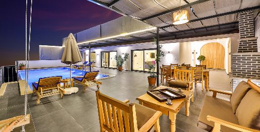 Bahçe : Bahçe içerisinde özel yüzme havuzu, 4 adet şezlong, 4 kişilik yemek masası, salıncak , barbekü, güneş şemsiyesi bulunmaktadır