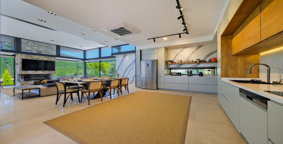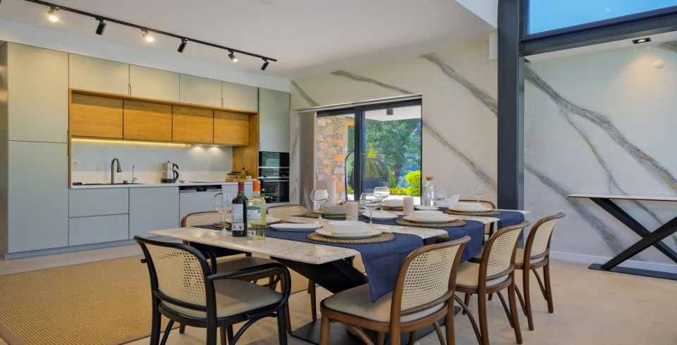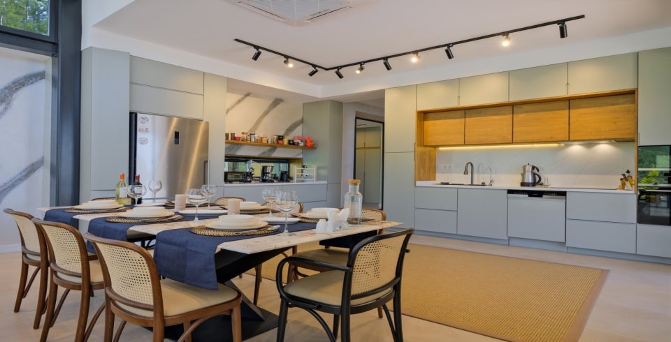 Mutfak: Villamızda tam donanımlı bir Amerikan mutfak yer almaktadır. Mutfakta bulaşık makinası, buzdolabı, ankastre fırın, mikrodalga fırın, ankastre 4’lü ocak, su ısıtıcısı, çamaşır makinesi, tost makinesi ve kahve makinesi gibi temel ekipmanlar eksiksiz şekilde mevcuttur. Ayrıca tencere ve tava takımı, yemek takımı, çatal-kaşık-bıçak takımı, bardak takımı, yemek masası ve sandalyeler ile yemek hazırlama ve servis alanı rahat bir şekilde kullanıma sunulmuştur.