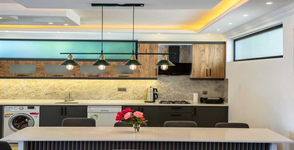 Mutfak : Modern Amerika mutfağımızda yemek masası, buzdolabı, çamaşır makinesi, mikrodalga fırın, 4’lü ocak, tost makinesi, elektrikli su ısıtıcısı, çatal-bıçak takımı, tencere-tava takımı, bulaşık makinesi bulunmaktadır.